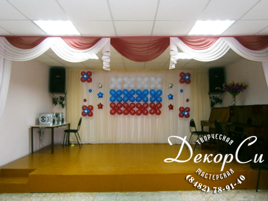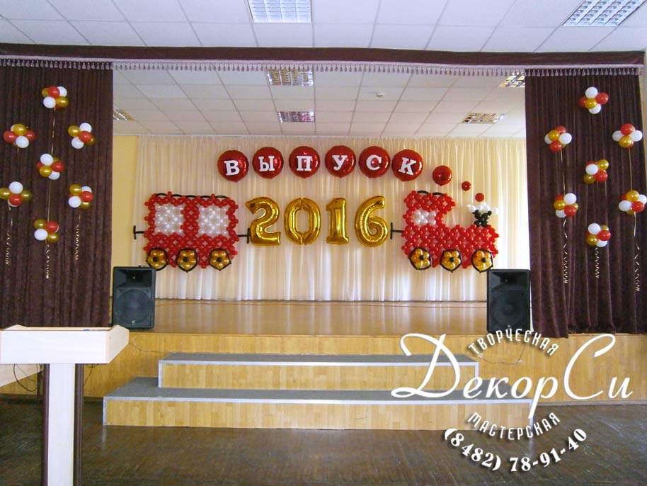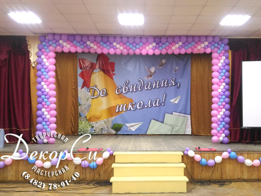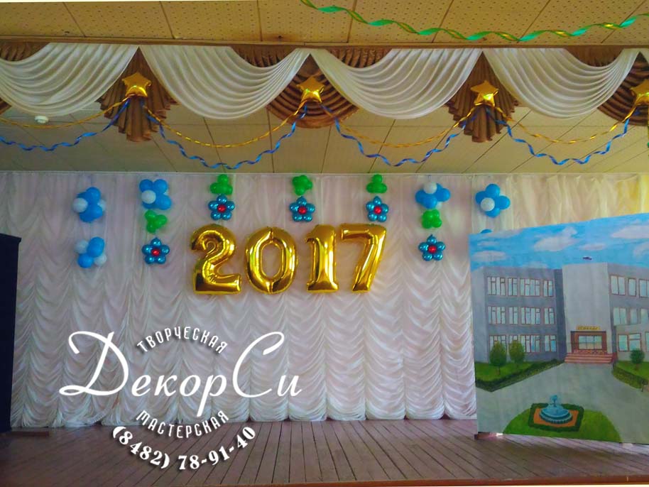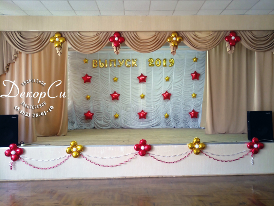 - украшение актового зала, сцены на последний звонок и выпускной в школе