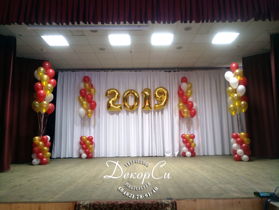 Сюда может войти, например, цифры из фольги, небольшие фонтаны из гелиевых шаров на сцену или украшение заднего фона сцены.